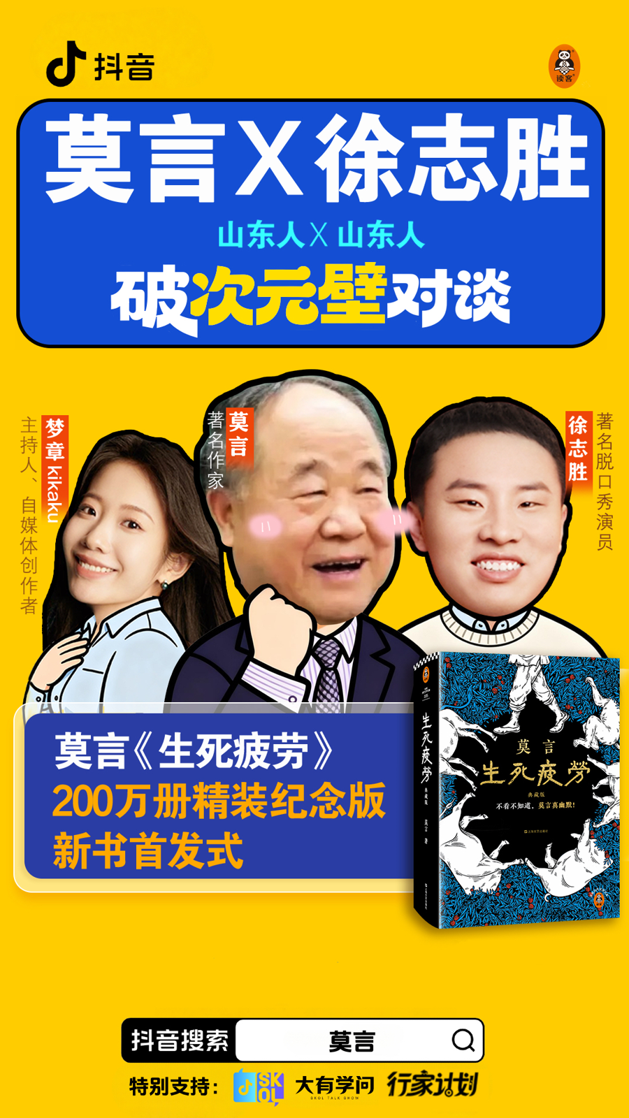 12月23日晚间,莫言携手脱口秀演员徐志胜、主持人@梦章kikaku现身抖音,完成首场“打破次元壁”的跨界直播对谈。本次直播以《生死疲劳》精装典藏版上线为契机,聚焦文学创作故事、当代年轻人精神现状等议题,用文学与喜剧的碰撞,为近300万网友带来了一场兼具知识厚度与欢乐氛围的思维盛宴。
