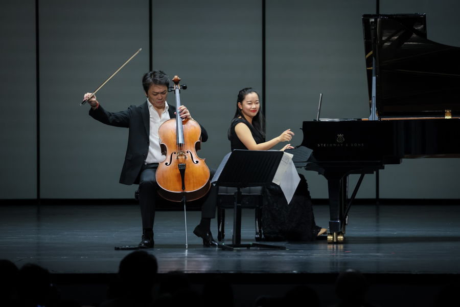 上半场,巴赫《C大调第三无伴奏大提琴组曲》如同一座复调音乐的宏伟圣殿。贝多芬献给友人艾德蒂伯爵夫人的《C大调第四大提琴奏鸣曲》,则藏着细腻的情感挣扎。下半场,托马斯·德蒙加创作的《EFEU:为大提琴独奏而作的无伴奏组曲》,以姓名缩写致敬瑞士大提琴大师埃马努埃尔·福尔曼。演奏过程中,秦立巍在琴弦上放了一件特殊物件,使其发出类似远方教堂钟声的声音,“带点特别的纪念”。布里顿《C大调大提琴与钢琴奏鸣曲》是写给友人大提琴家罗斯特罗波维奇,秦立巍第一次演奏这个作品,也是在罗斯特罗波维奇曾演出的地方,“所以这个曲子对我也非常有意义”。